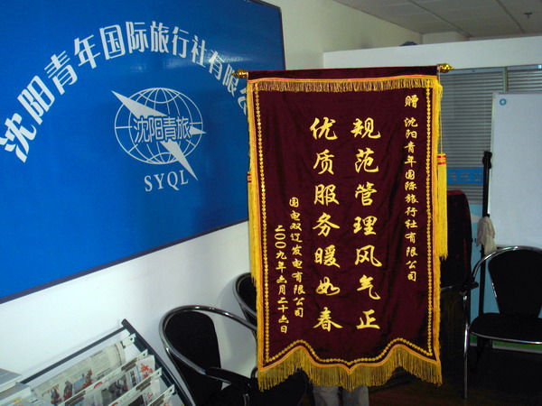 2009年6月30日,沈陽(yáng)青旅出境中心再獲國(guó)電雙遼發(fā)電有限公司贈(zèng)予的錦旗,這是09年上半年來(lái)出境中心獲得客戶贈(zèng)予的第三面錦旗。