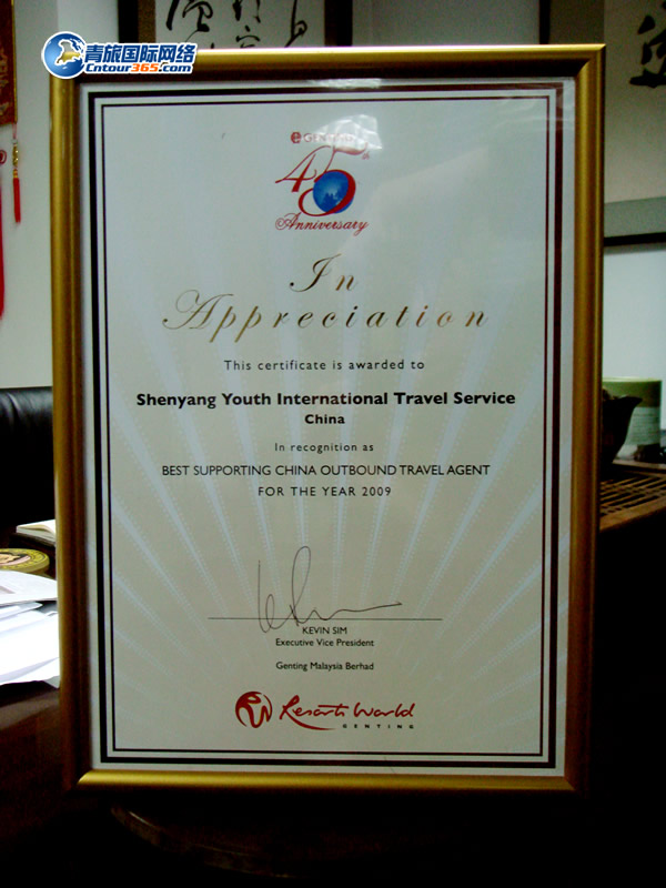 2010年4月25日,沈陽青年國際旅行社董事長倪琛善先生受新加坡名勝世界、馬來西亞云頂娛樂城集團邀請,出席馬來西亞云頂娛樂城45周年慶典,并問鼎“year 2009 best supporting china outbound travel agent”大獎,成為東北三省唯一一家被授予“2009年中國最佳出境組團社”殊榮的中國旅行社。
