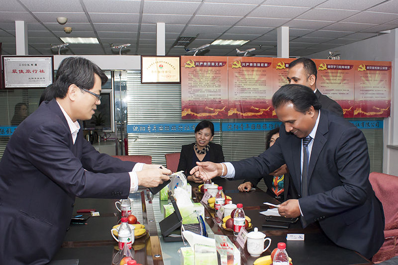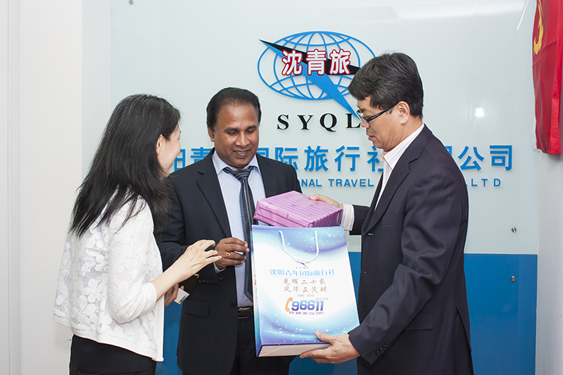 5月20日晚七時許,Silva市長一行來到了沈陽青旅會議室和倪琛善先生進行會晤,倪琛善先生首先通過翻譯向Silva市長談了自己在斯里蘭卡考察歸來后的感受,對Silva市長辦公室的干凈整潔給予了極高的贊譽。高爾市作為錫蘭紅茶的重要產地,Silva市長更是對倪琛善先生準備的西湖龍井贊不絕口。短暫的交流過后,雙方對沈陽和高爾兩市的旅游合作展開了深入探討,一致認為作為友好城市,兩市的旅游市場有著良好的發展前景,豐富的旅游資源激發了更加廣闊的旅游市場開發,如今的中斯兩國旅游已朝向更高水平的品牌化發展,沈陽赴斯里蘭卡的旅游更應將游客把目光從科倫坡引向文化古城高爾市。會議在愉快的氛圍中進行,現場不時發出會心的笑聲。陪同參加會議的還有高爾市市長秘書Pradeep Ehan先生和沈陽青旅總經理助理狄子健女士。