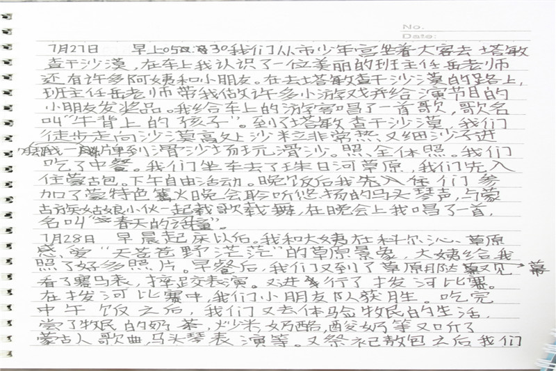 早統(tǒng)一集合后,赴通遼塔敏查干沙漠,體驗(yàn)了刺激的滑沙活動(dòng),在廣袤的沙漠內(nèi)進(jìn)行了寫生繪畫、沙漠內(nèi)舉行沙漠足球、拔河比賽、沙漠徒步走五公里等精彩的活動(dòng),并評(píng)出優(yōu)秀徒步隊(duì)員。短暫而又舒適的休息后赴科爾沁草原腹地——珠日河草原,熱情好客的蒙古族同胞們?yōu)榇蠹艺宫F(xiàn)了草原馬隊(duì)迎賓、科爾沁草原迎賓禮、敬下馬酒,晚上宿蒙古包,真真切切體驗(yàn)了一把游牧民族的生活。
