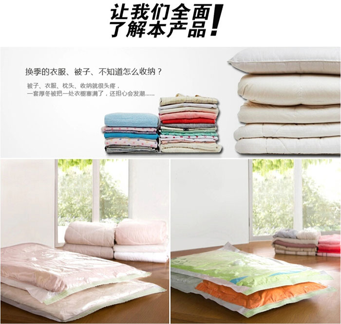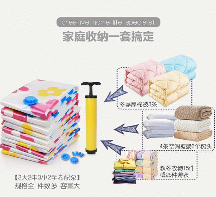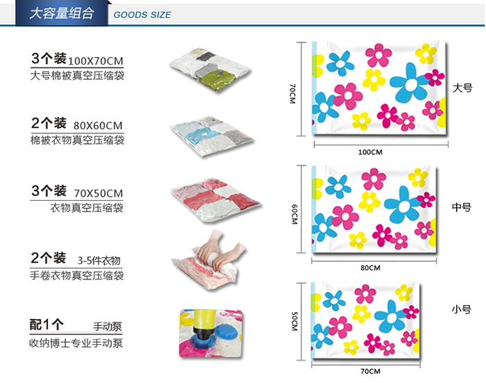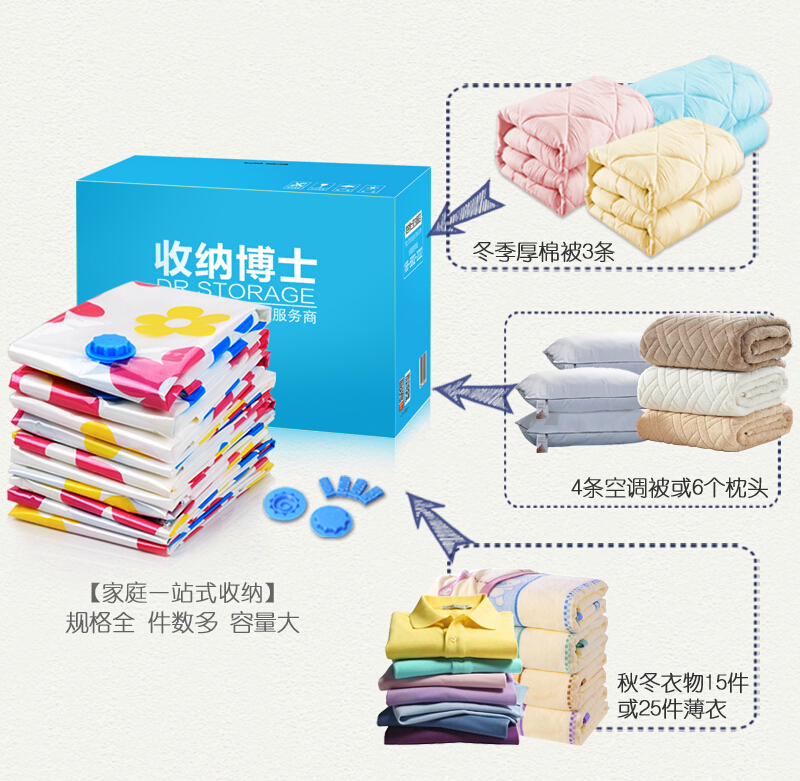 產品名稱:收納博士 保鮮膜壓縮形式: 袋壓抽氣式 材質: PA+PE材質 適用對象: 衣物 絨毛玩具 被子 套裝規格: 3大2中3小2手卷1泵